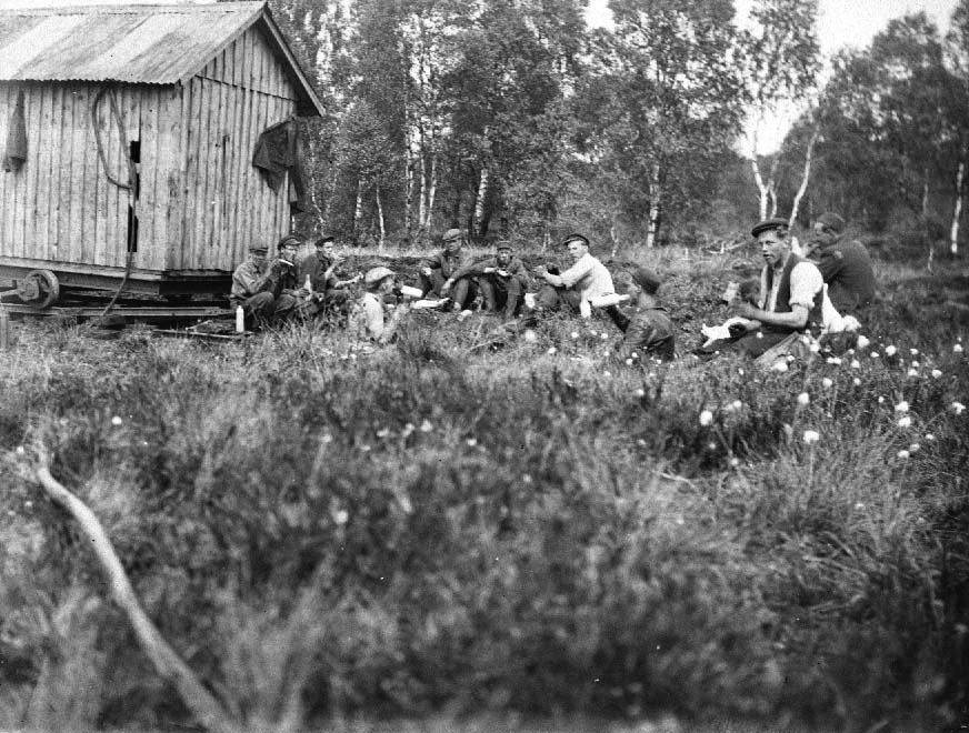 Bilden ovan togs då torvarbetarna på torvmossen (Rågmyren) i Karsholm åt medhavd lunch. Personerna är - från vänster - Karl-Åke Almén, Erik Vingren, Erik Almén, Olle Svensson, Hugo Brink, Helge Brink, Enock Månsson, Stig Johansson, Karl Paulsson, Karl-Gerard Liljenberg.